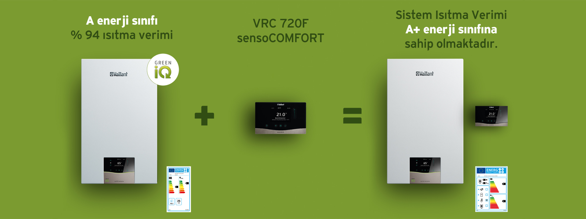 Green iQ 36 tekil cihaz olarak %94 ısıtma mevsimsel verimliliğine ve A enerji ısıtma verimliliğine sahiptir. Green iQ 36 ile birlikte verilen VRC 720f kablosuz kontrol seti ile birlikte %98 sistem ısıtma mevsimsel verimliliğine ve A+ sistem ısıtma enerji sınıfına sahip olmaktadır.